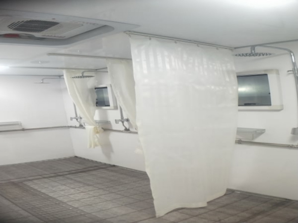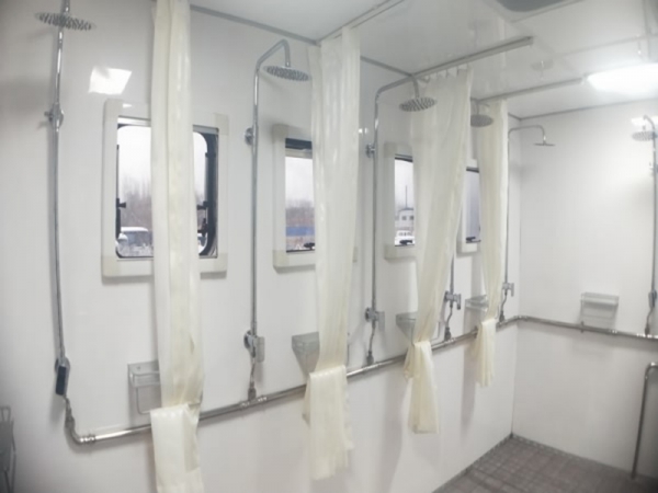 1、車內共有 3 個區(qū)域,分別為后更衣區(qū)、中淋浴區(qū)、鍋爐區(qū)燃油熱水鍋爐、不低于2.8KVA 柴油發(fā)電機、水泵、精密過濾器、暖風機、滅火器、通風窗、照明燈;淋浴間設置 12 個淋浴噴頭、不銹鋼水箱、皂盒、通風窗、照明燈;內設要有更衣柜、衣帽鉤、照明燈、換氣扇等配套設備。(配套設備漏掉*需增加)。